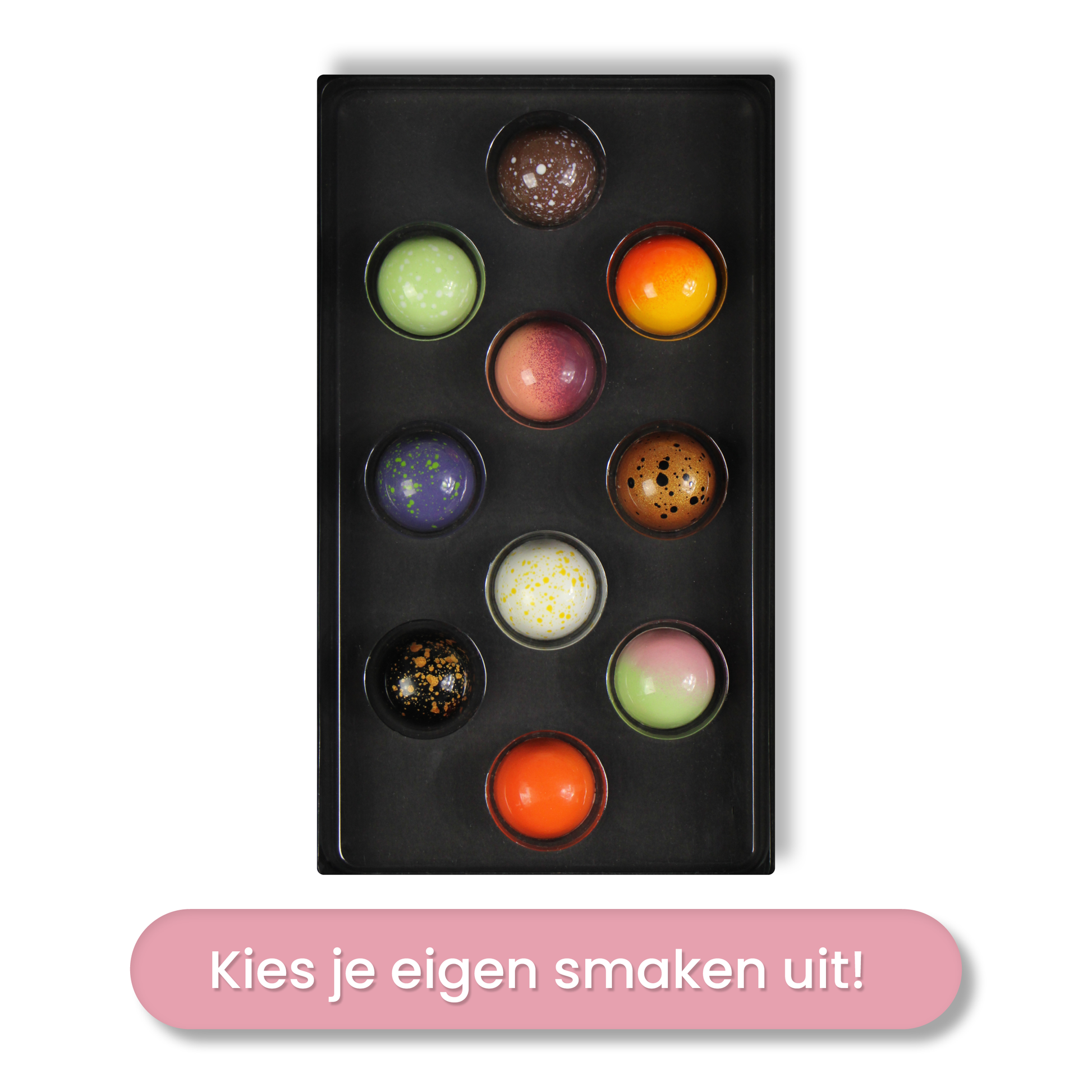 Maak indruk met een luxueus verpakte doos van 10 handgemaakte bonbons! Deze originele lekkernijen zijn de perfecte manier om je waardering te tonen. Kies zelf uit de lekkerste smaken en stel je eigen doosje samen. Voeg een persoonlijke boodschap toe voor een extra speciaal tintje.