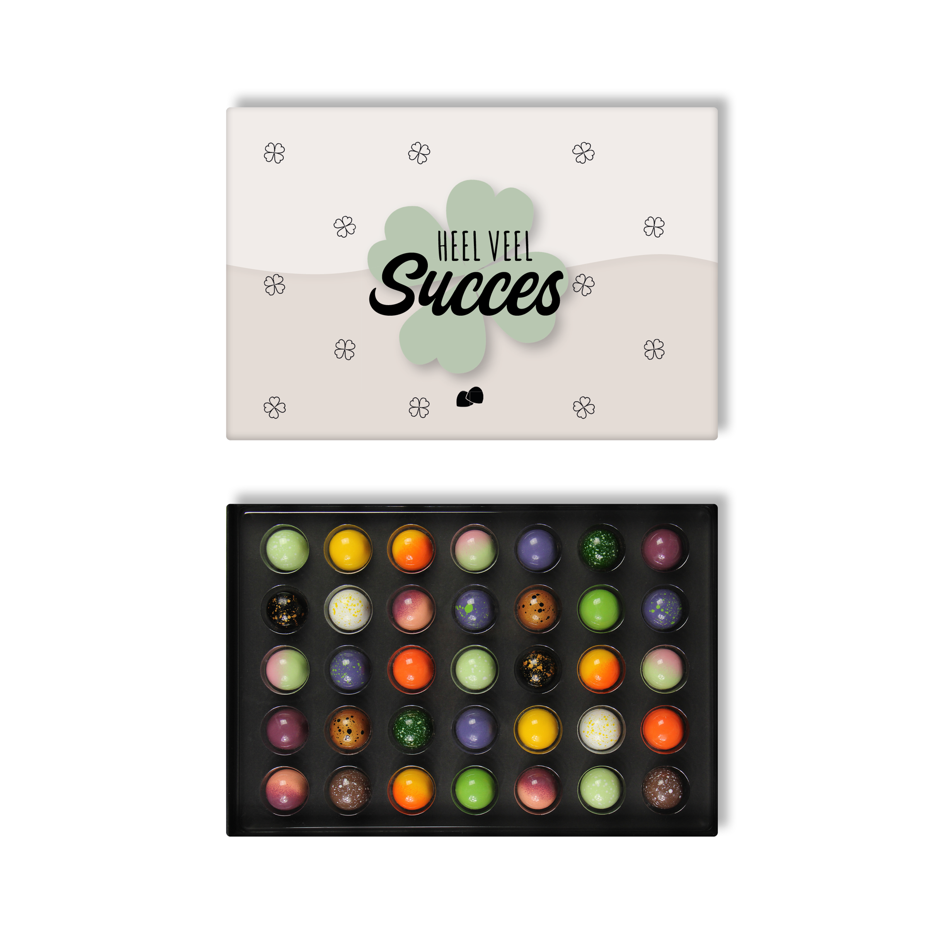Wens succes met 35 handgemaakte fairtrade bonbons in een luxe verpakking, perfect als succes chocoladecadeau voor examens of promoties. Voeg een hartelijke boodschap toe voor een motiverend brievenbuscadeau!